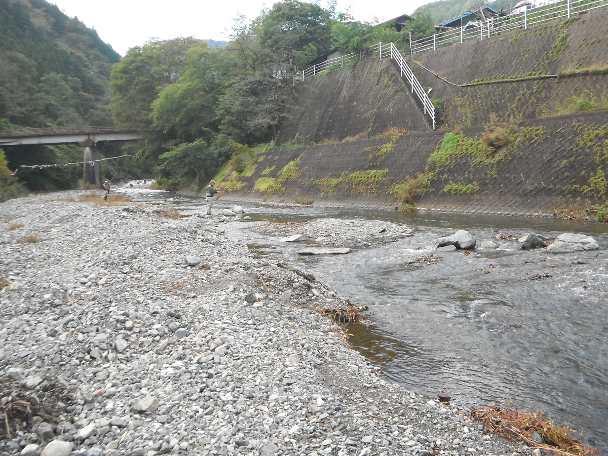 小菅橋の下流側~上流側の区間も比較的、水深のない区間が続いています。人工的な段差が造成されていますので、その落ち込みの水深のあるポイントには魚が付いています。