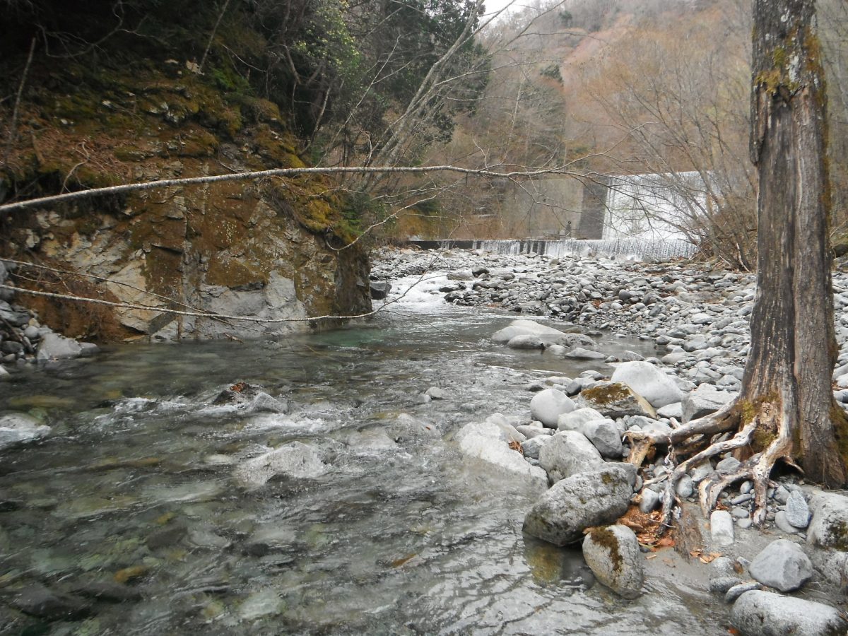 写真にある堰堤は、登山道を使って高巻きします。登山道の階段を登り切ってから200mほど進んだあたりから、踏み後を通って川に下りることができます。