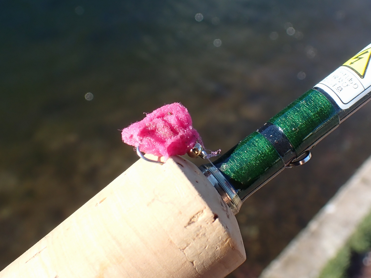 このポンドの当たりフライは白とピンクのエボレスフライでした。